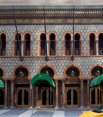The New York City Center features a grand auditorium with 2,750 seats and showcases Moorish Revival architecture with intricate sandstone decorations and domed roof.