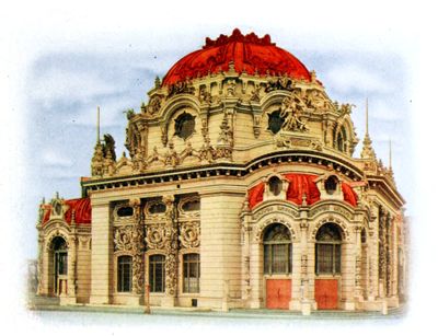 Four sculptural groups by Isodore Konti decorated the entrance portals, representing sacred, lyric, dance, and heroic musical themes.