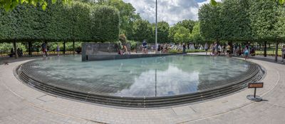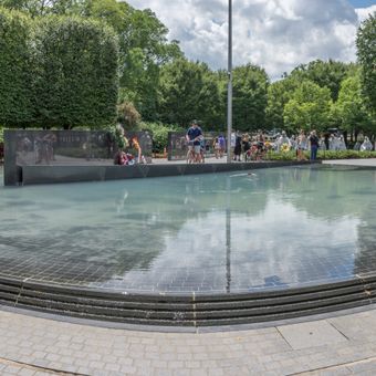 Visitors often leave tokens of remembrance near the base of the granite panels, following a tradition common at military memorials across the capital. The names of contributing nations appear etched into stone, showing how forces from fifteen countries fought alongside American troops.