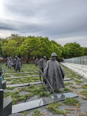 The Korean War Veterans Memorial is a monument on the National Mall in Washington honoring those who served in the conflict between 1950 and 1953. The soldier statues walk in a line across open ground flanked by low stone walls, accompanied by a polished granite panel that reflects their forms and visually doubles the group to 38 figures.