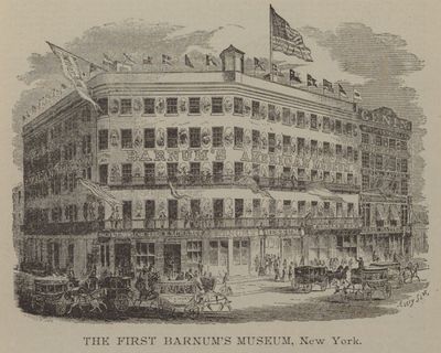 Barnum's American Museum was a five-story building at the corner of Broadway and Ann Street in Manhattan that displayed taxidermy animals, wax figures, and live creatures. The building contained several exhibition halls, a basement aquarium, and a lecture hall where theatrical performances also took place.