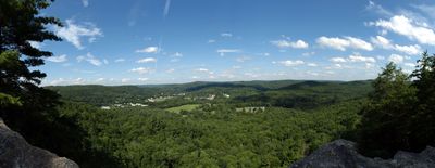 Black Rock State Park is a woodland park in Watertown featuring forested hills, lakes, and streams spread across the landscape. The terrain includes trails that wind through dense woods and along water features throughout the property.