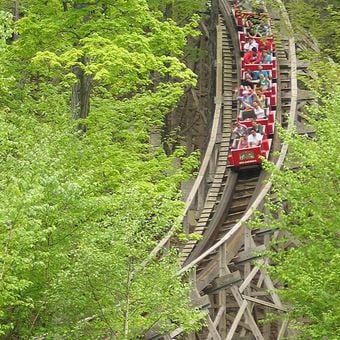 Boulder Dash is a wooden roller coaster at Lake Compounce that twists through 1,440 meters of forested mountain terrain. The ride reaches speeds around 60 miles per hour with steep drops and sharp turns carved between the trees.