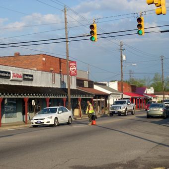 Pembroke is a town in Robeson County, North Carolina, located roughly 90 miles from the Atlantic coast across flat land. The settlement developed around a train station and maintains a small-town character with buildings from different periods of its growth.