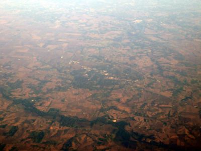 The city extends across flat terrain at 256 meters elevation, with a structured grid layout of streets centered around the county courthouse square.