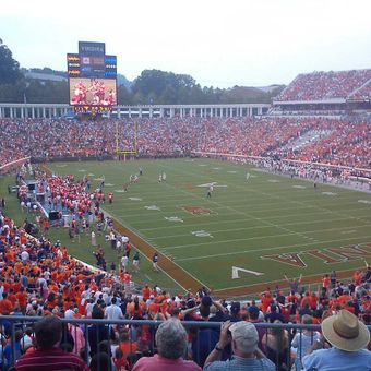 Scott Stadium is a football venue in Albemarle County with approximately 61,500 seats positioned to offer views of the Blue Ridge Mountains and Monticello Mountain. The seating layout allows spectators to see the mountain landscape throughout the game, making the natural surroundings part of the experience.