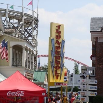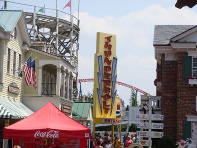 The Thunderbolt features a figure-eight track layout stretching 2,600 feet with a height of 70 feet and operates at speeds up to 40 miles per hour.