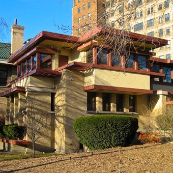 Frank Lloyd Wright designed this house in 1915 for Emil Bach, co-owner of Bach Brick Company, following the principles of his 1907 Fireproof House concept.
