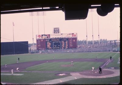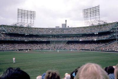 Metropolitan Stadium contained three tiers of grandstands extending from behind home plate with white metal structures rising against the Minnesota sky.