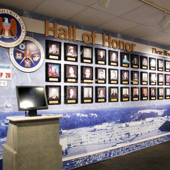 The NSA Hall of Honor is a memorial space within the National Cryptologic Museum displaying plaques and exhibits about individuals who made major contributions to American cryptology and national security. The room documents the development of encryption techniques and the professionals who advanced this work.