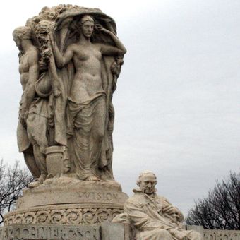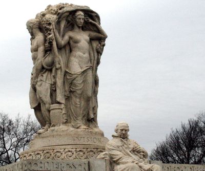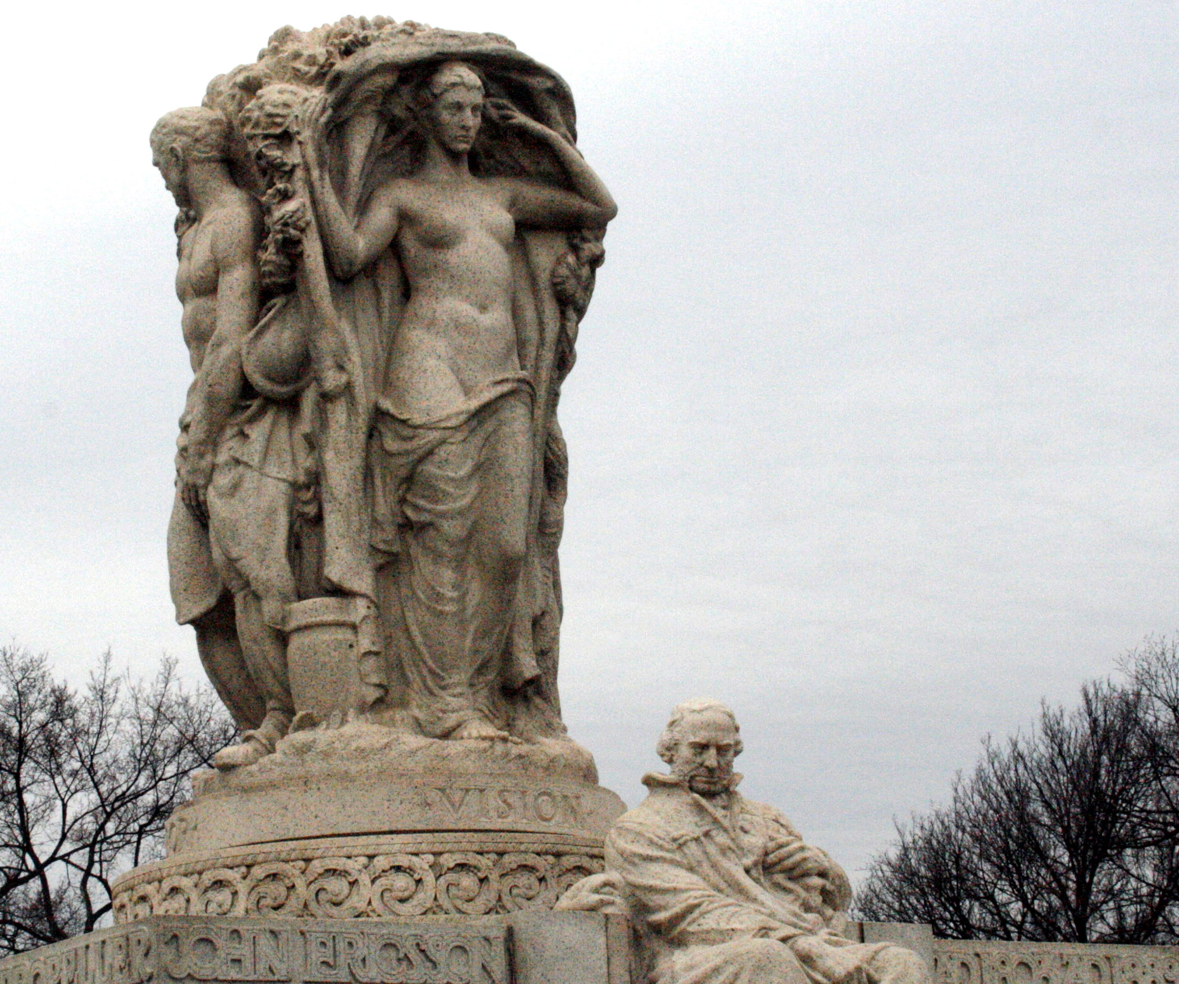 The John Ericsson National Memorial features a seated figure of the inventor alongside three standing figures representing adventure, labor, and vision in pink granite.