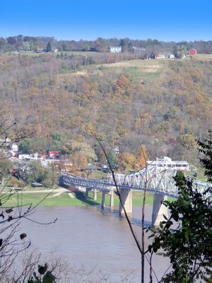 The Milton-Madison Bridge spans 3,184 feet across the Ohio River, connecting the states of Kentucky and Indiana with two traffic lanes and a pedestrian walkway.