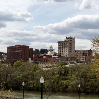 Fairmont is a small city on the Monongahela River in north central West Virginia, sitting at roughly 300 meters elevation between Morgantown and Clarksburg. The riverbanks shape the layout of the town, while homes and businesses spread across the gentle hills typical of this region.