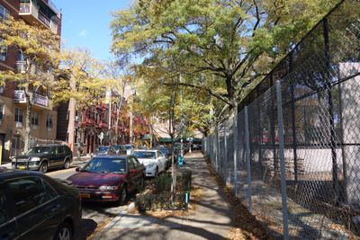 The neighborhood spans across several blocks with a mix of apartment buildings, small houses, and commercial establishments along its main streets.