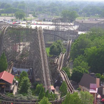 Thunder Run is a wooden roller coaster at Kentucky Kingdom in Louisville that follows a double out-and-back track layout. The ride carries passengers in trains of six cars that cycle through the course continuously throughout the day.