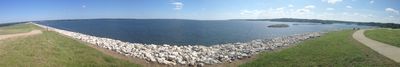 The reservoir includes a 425-acre Lower Lake formed by dredging operations, featuring recreational facilities and John W. Kyle State Park.