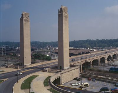 The bridge commemorates military service through two limestone pylons inscribed with dates of eight American wars and decorated with granite benches listing battles of Pennsylvania troops.