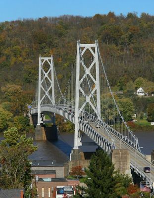 The Simon Kenton Memorial Bridge is a suspension bridge that crosses the Ohio River between Maysville, Kentucky and Aberdeen, Ohio. The steel structure uses cables and towers with a distinctive X-pattern bracing system to span the river.