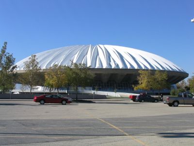 The State Farm Center features a massive 400-foot-diameter concrete dome structure rising 125 feet above the ground with seating for 16,618 spectators.