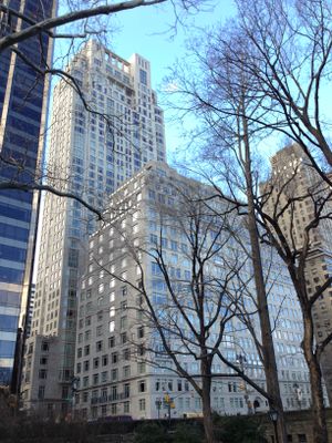 The 35-story limestone tower and 19-story residential building feature classical architectural elements, large windows, and metal balconies facing Central Park.