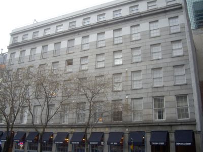 The granite facade displays hallmarks of Greek Revival style that rarely appear in the city today. Classical proportions and stone craftsmanship remain visible in the building's structural elements along John Street.