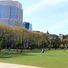 Cadman Plaza is a public park in Downtown Brooklyn with wide paved paths, benches, and grassy areas spread across several blocks between Brooklyn Heights and Downtown Brooklyn. The space accommodates walking, sitting, and gathering among the surrounding office buildings and urban landscape.