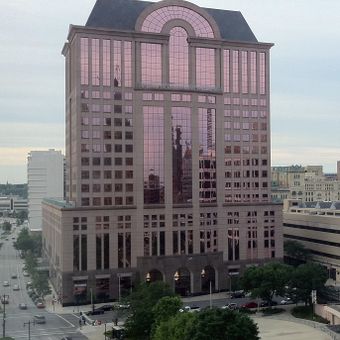 The 1000 North Water Street building rises 16 stories high with a light pink granite exterior and tinted windows in the Milwaukee skyline.