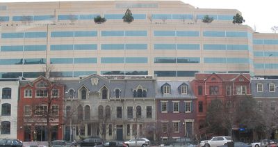 2000 Pennsylvania Avenue is a mixed-use development in Foggy Bottom that combines a ten-story office tower with preserved historic row houses fronting the street. The complex includes office space, parking, a fitness center, and conference facilities.