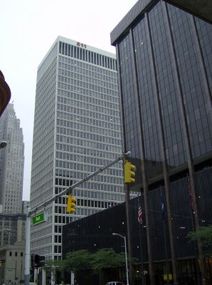 The Detroit Economic Club maintains its headquarters in this International style building, which forms part of Detroit's central business district landscape.