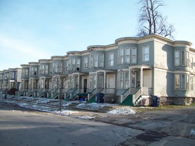 The row represents one of only four remaining groups of similar housing in the Masten neighborhood, reflecting Buffalo's late 19th-century residential development patterns.