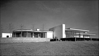 The design merges European modernist principles with American architectural elements, incorporating horizontal lines and strategic window placement across the single-story structure.