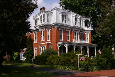 The Adam Orris House features a mansard roof, decorative cornices, and ornate window treatments that define its Second Empire architectural style from 1887.