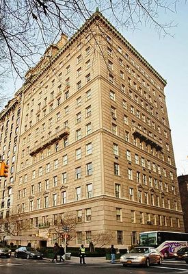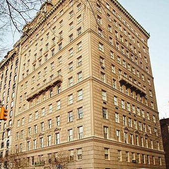 The twelve-floor apartment building features symmetrical architecture with decorative cornices, moldings, and classical elements facing Central Park.
