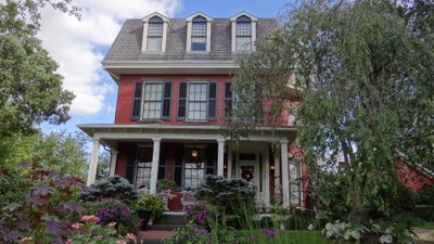 The three-bay brick house at 256 Prairie Street features rectangular windows with stone sills, paneled square columns, and a mansard roof with dormers.