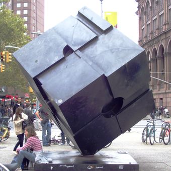 Located near the Astor Place subway station, the one-ton steel cube rotates on a central pivot when multiple people push its surfaces together