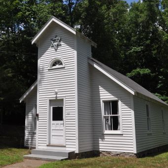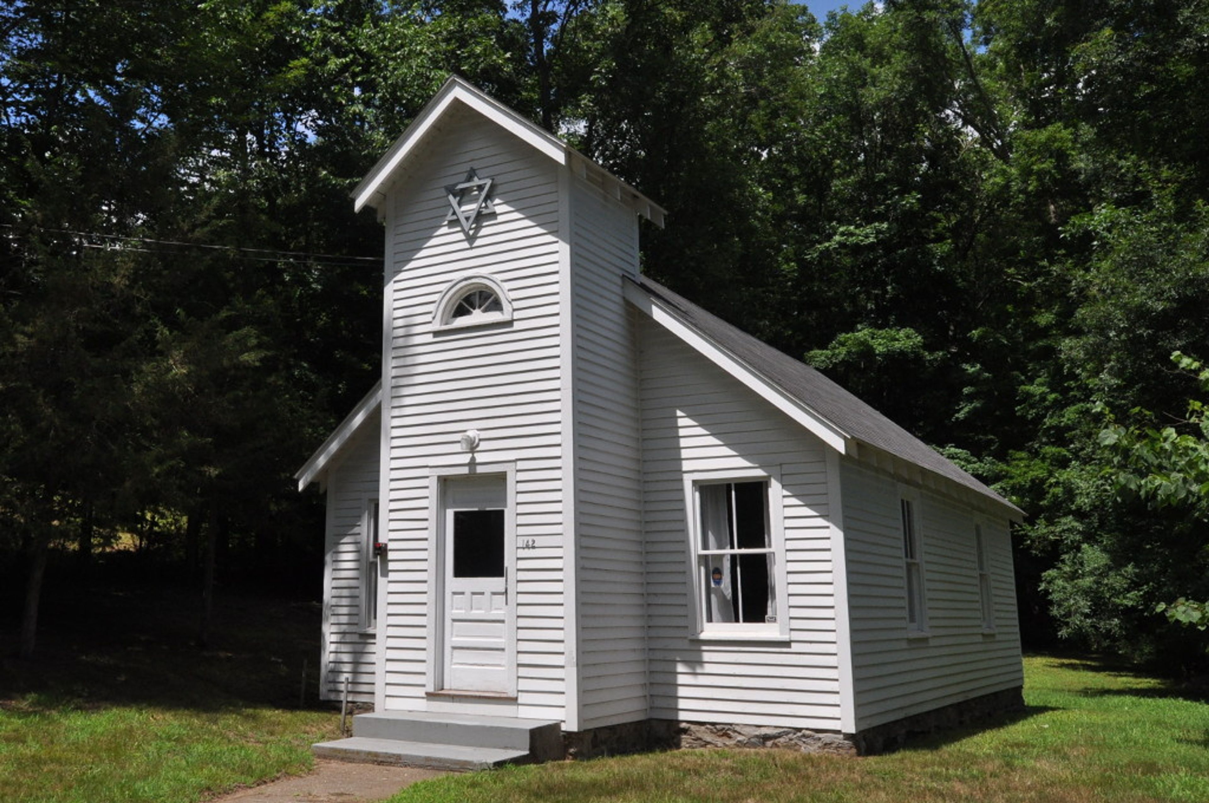 The Anshei Israel Synagogue stands as a 20 by 30 feet gable-roofed clapboarded building with a central projecting tower topped with a Magen David.