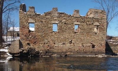 The Archibald Mill stands as stone ruins along the Cannon River, with remnants of both the 1857 and 1870 structures visible from the riverbank.