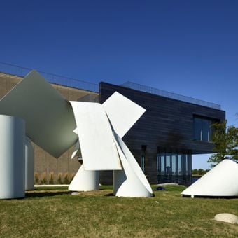 The reflective white surface of the steel cylinders changes appearance throughout the day as light conditions shift across the museum grounds.