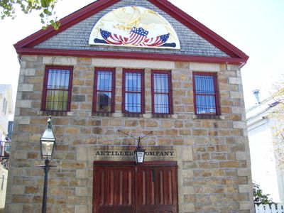 The Artillery Company of Newport occupies a Greek Revival building constructed in 1835, featuring stone and brick architecture with a second story added in 1906.