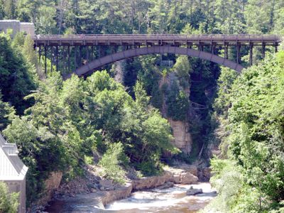 The AuSable Chasm Bridge extends 526 feet across the Ausable River with a main steel arch span of 222 feet and two concrete approach spans.
