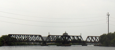 The American Bridge Company fabricated this three-span through truss swing bridge in 1910, replacing an earlier iron structure from 1886.