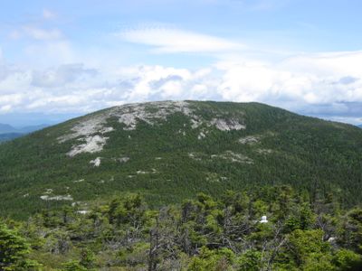 The granite-topped Baldpate Mountain rises to an elevation of 3,813 feet, featuring two distinct peaks connected by a mountain saddle in Oxford County.