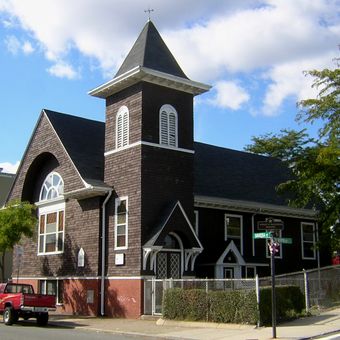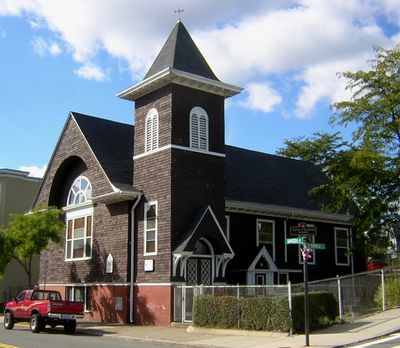 The building incorporates wooden shingles throughout its exterior, representing a characteristic example of early 20th-century New England ecclesiastical design.