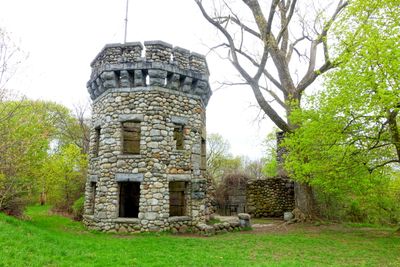 The stone structure sits atop Gibbet Hill, featuring remaining walls and a fieldstone tower that overlooks the Massachusetts countryside at 42 degrees north.