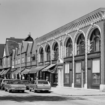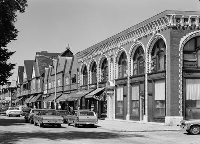 Each building in the district displays different architectural elements, from brick facades and mansard roofs to applied half-timbering and distinctive storefront designs.