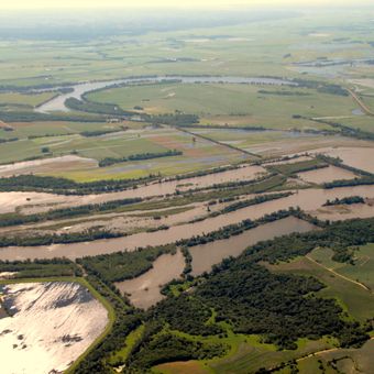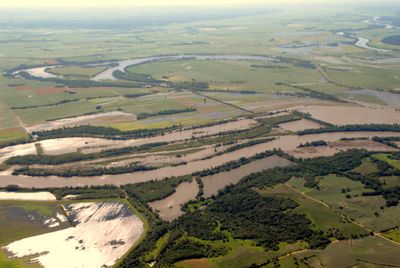 The shallow waters of the oxbow lake create wetland environments that support numerous species of waterfowl during their seasonal migrations.