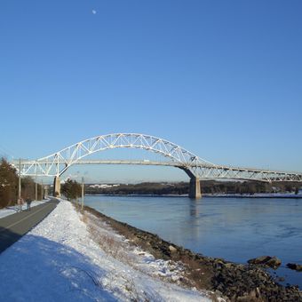 The structure features a 135-foot clearance above the water, allowing large commercial vessels to pass underneath through the Cape Cod Canal.