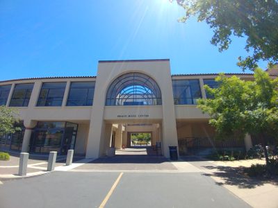 The Braun Music Center features a two-story structure with stucco facade, glass arches, and red-tiled columns along an open-air arcade through Lausen Mall.