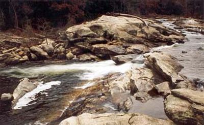 Bull Sluice forms a 14-foot cascade through granite boulders, creating two distinct drops along the Chattooga River at the state border.