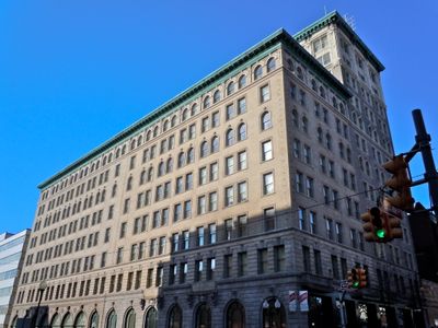 This thirteen-story steel-framed building features brick and terra cotta walls at the intersection of East State Street in downtown Trenton.